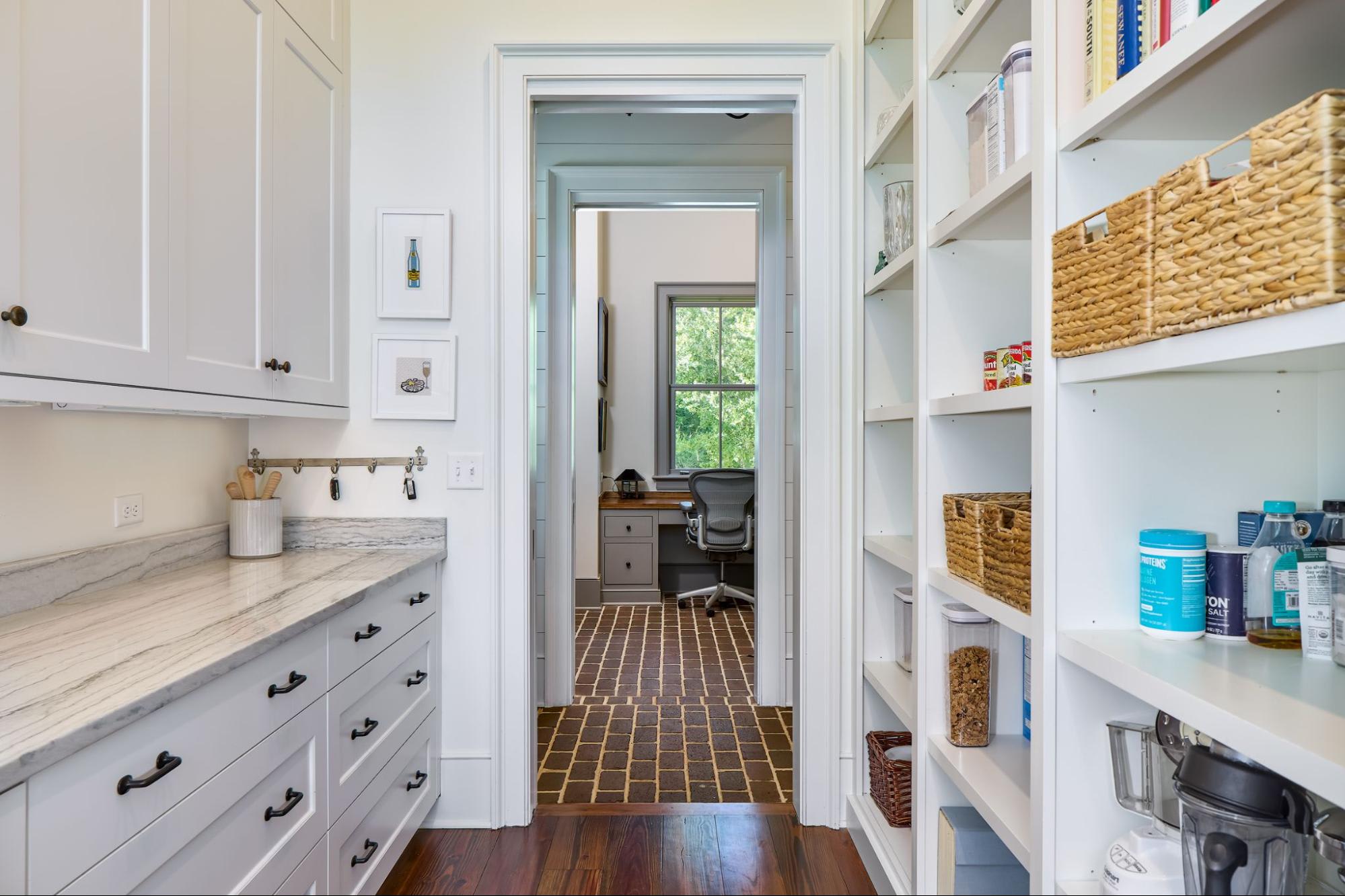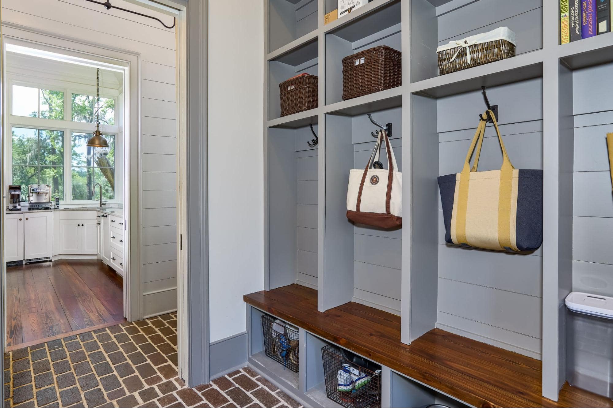 A mudroom, laundry room, and office provide additional zones for keeping track of moving pieces and organizing the housekeeping. Throw a load of laundry in between video meetings, greet the kids as they come in from an afternoon of adventure, and let the dog shake off the remnants of outdoor play on the lawn. The exposed brick floors are both beautiful and highly functional, while built-in cubbies for coats and shoes make organization a breeze.