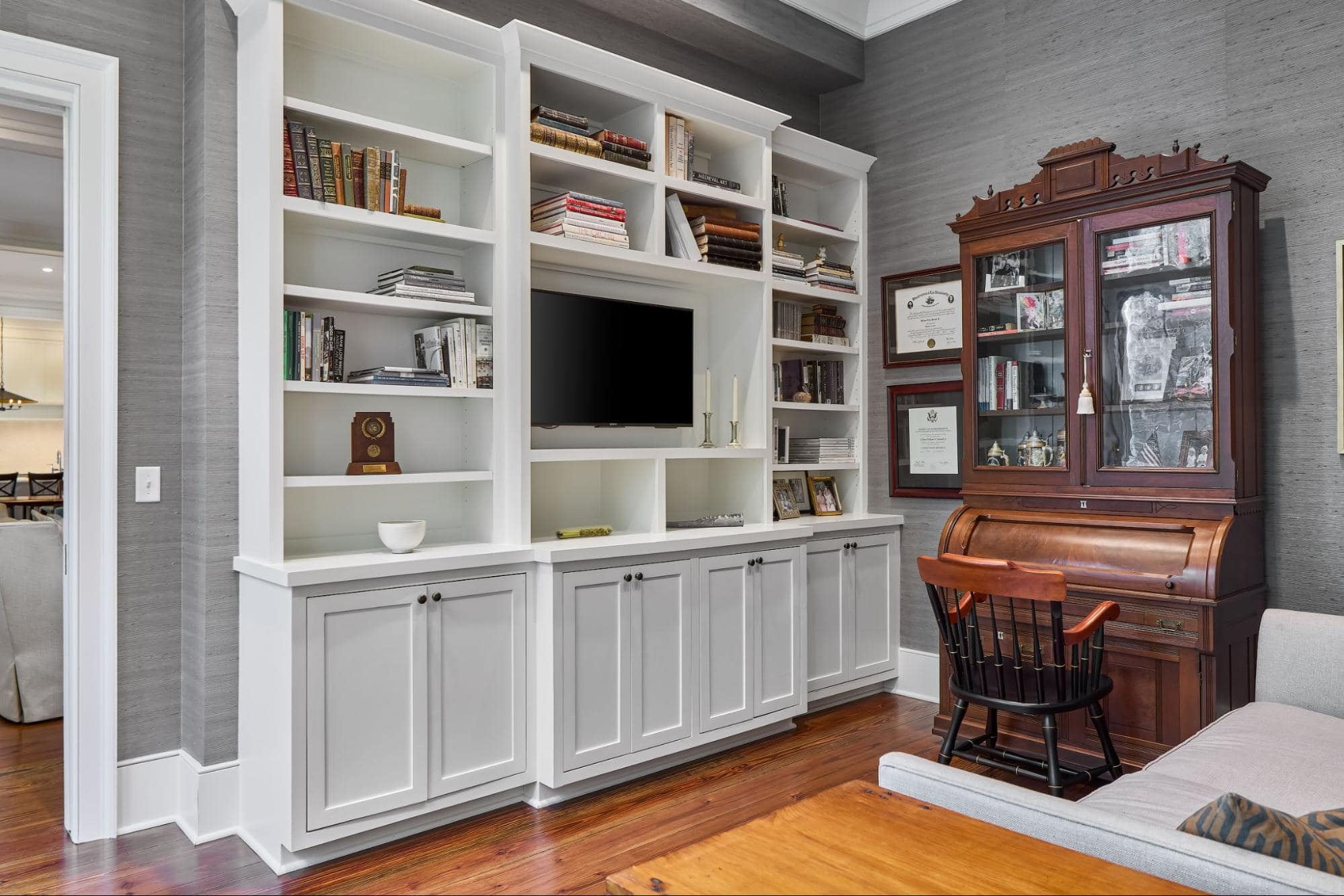 The spacious primary suite is situated on the first floor for ease of access and boasts soaring ceilings, gorgeous window treatments, and walk-in closets with custom cabinetry. Adjacent is the primary bath featuring his-and-her vanities along with plantation shutters that usher in ample lighting. The most unique aspect of this primary suite is the study, which features ceiling-high custom built-ins complete with a space for home entertainment.