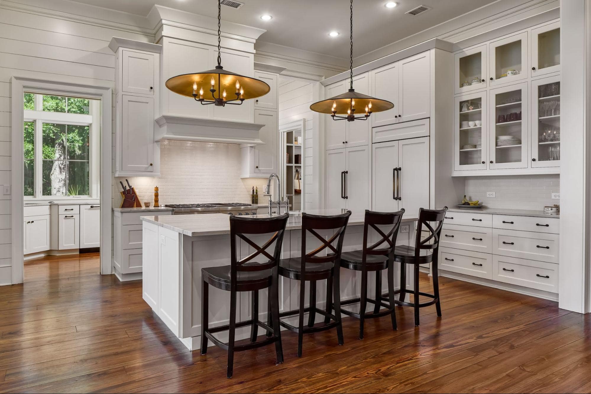 The light and bright kitchen provides ample seating around an oversized island. A walk-in pantry, coffee bar, and cozy breakfast nook make for a delightful morning wake-up routine! Don’t forget the chef-worthy gas stove top and refrigerator, which is cleverly disguised beneath clean white custom cabinetry with sleek hardware.