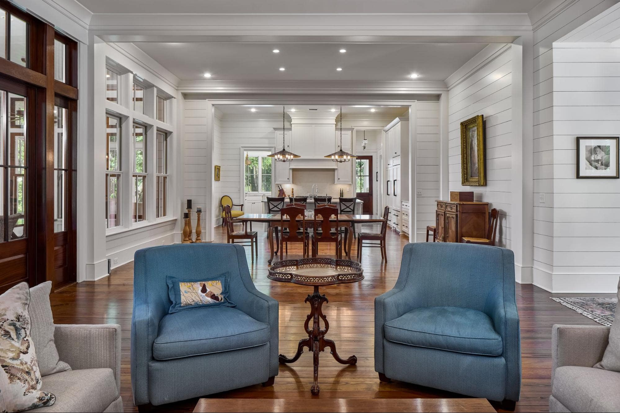 If the gorgeous half-moon driveway and sprawling front porch don’t immediately enchant you, the soaring brick fireplaces and spacious five bedrooms, six bathrooms, and two half-baths will. Listed by the Ussery Group, this immaculate home in the May River Forest neighborhood of Palmetto Bluff sold for $3,275,000 after less than two weeks on the market, and it’s not hard to see why. The designer interior includes shiplap walls, heart pine floors, a mudroom/laundry area, and a stunning white kitchen with marble countertops. Seagrass wallpaper, patterned tiles, and other coastal touches complete this Lowcountry estate. The property is situated on nearly two acres of land and is a beautiful example of the types of homes currently available in Palmetto Bluff. Let’s take a look at a few additional details now!