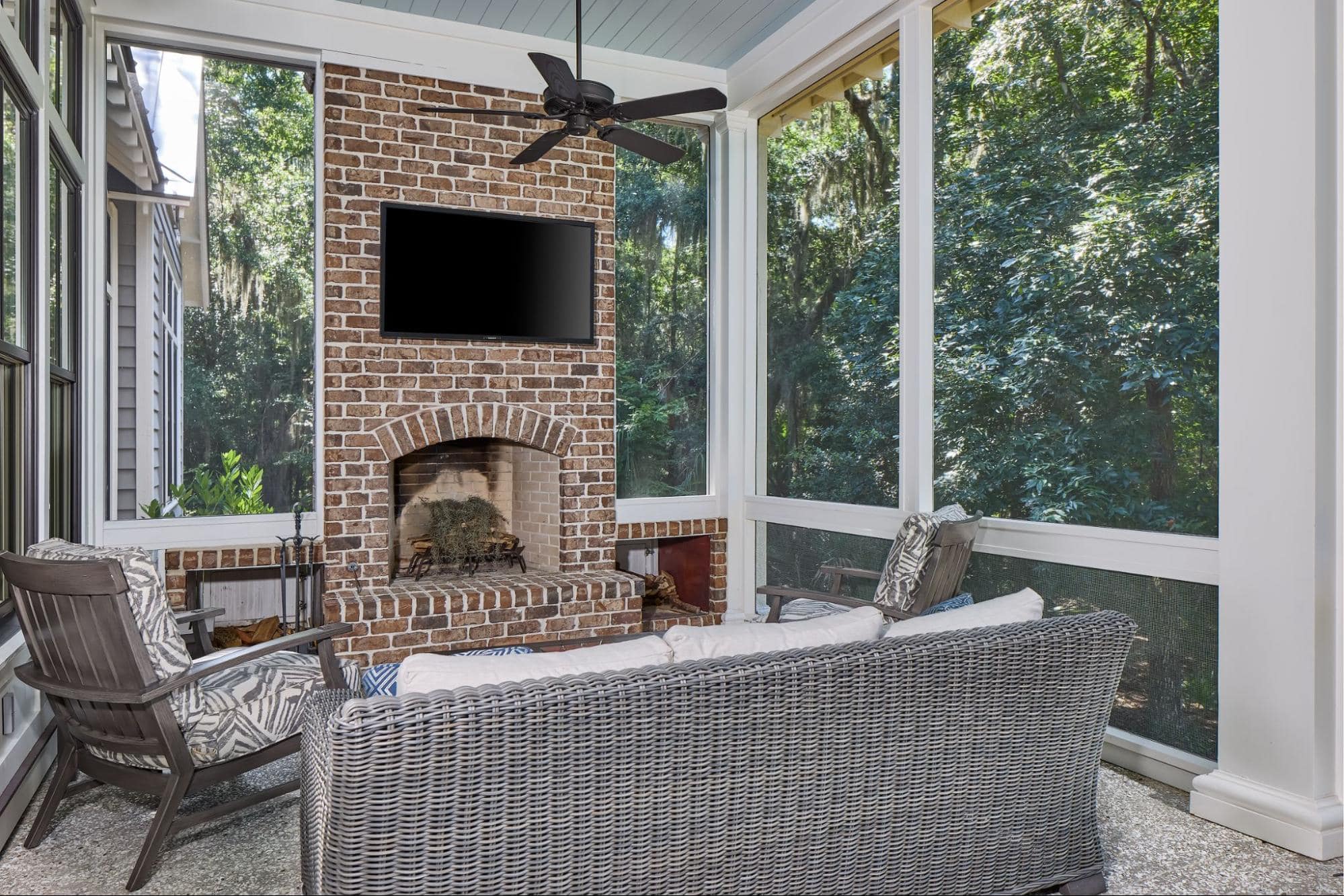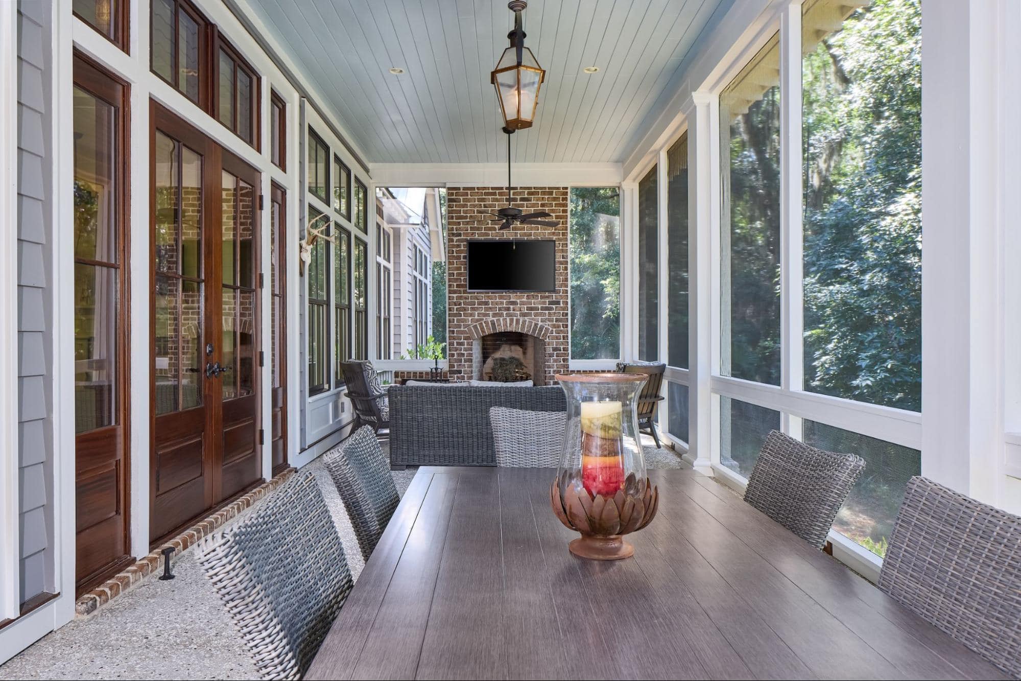End the day out back on the screened porch, which boasts a gorgeous brick fireplace and full dining table for outdoor meals. The room is complete with a ceiling fan and ample space to unwind and catch the football game on Saturdays. High ceilings with luxurious lighting and fans add to the well-appointed indoor-outdoor space.