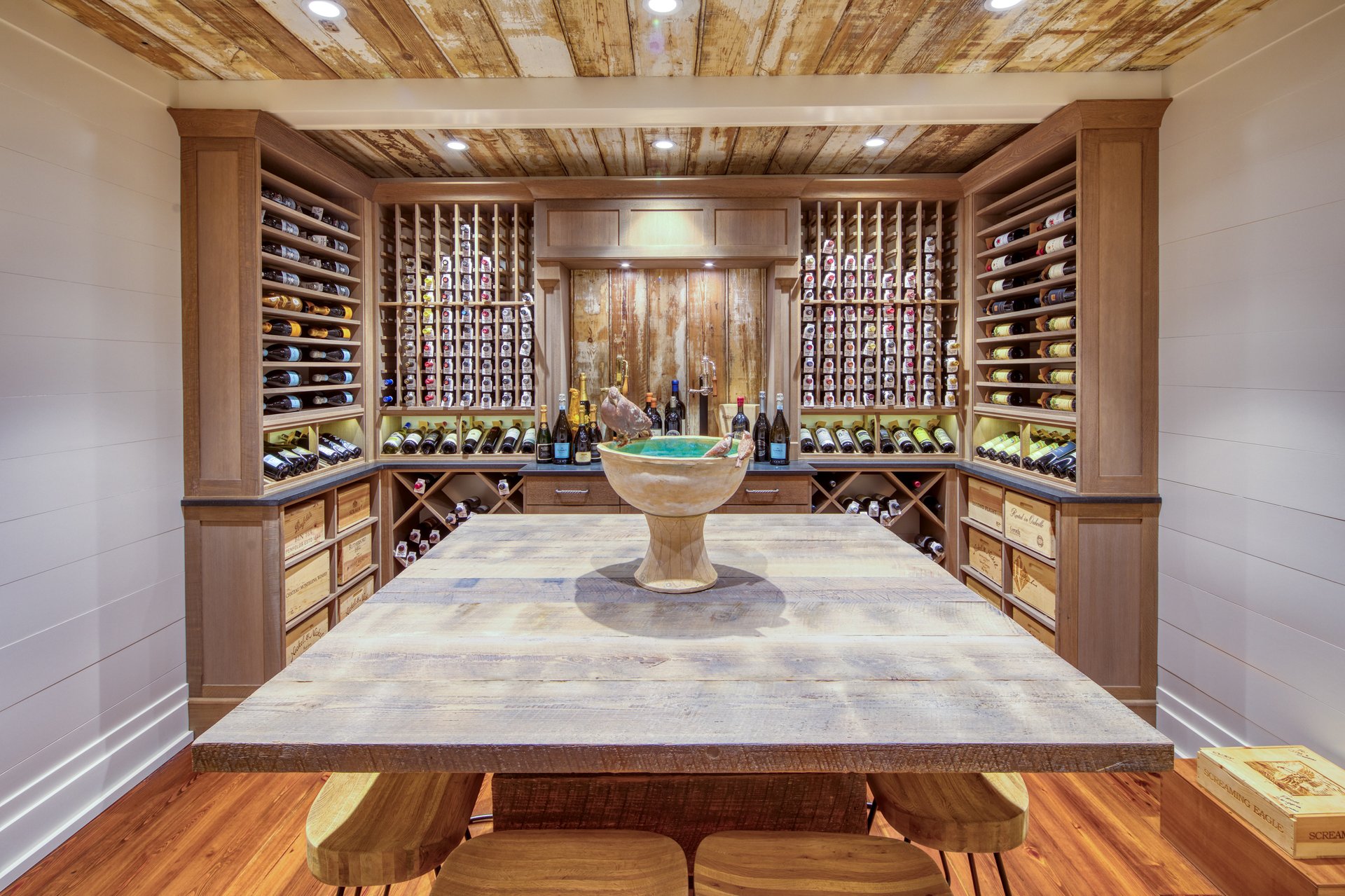 The lower level offers exceptional entertainment spaces with media and game rooms, a temperature-controlled wine room, craft and wrapping room, pressing room, two bunk rooms, and a private guest suite with its own entrance.