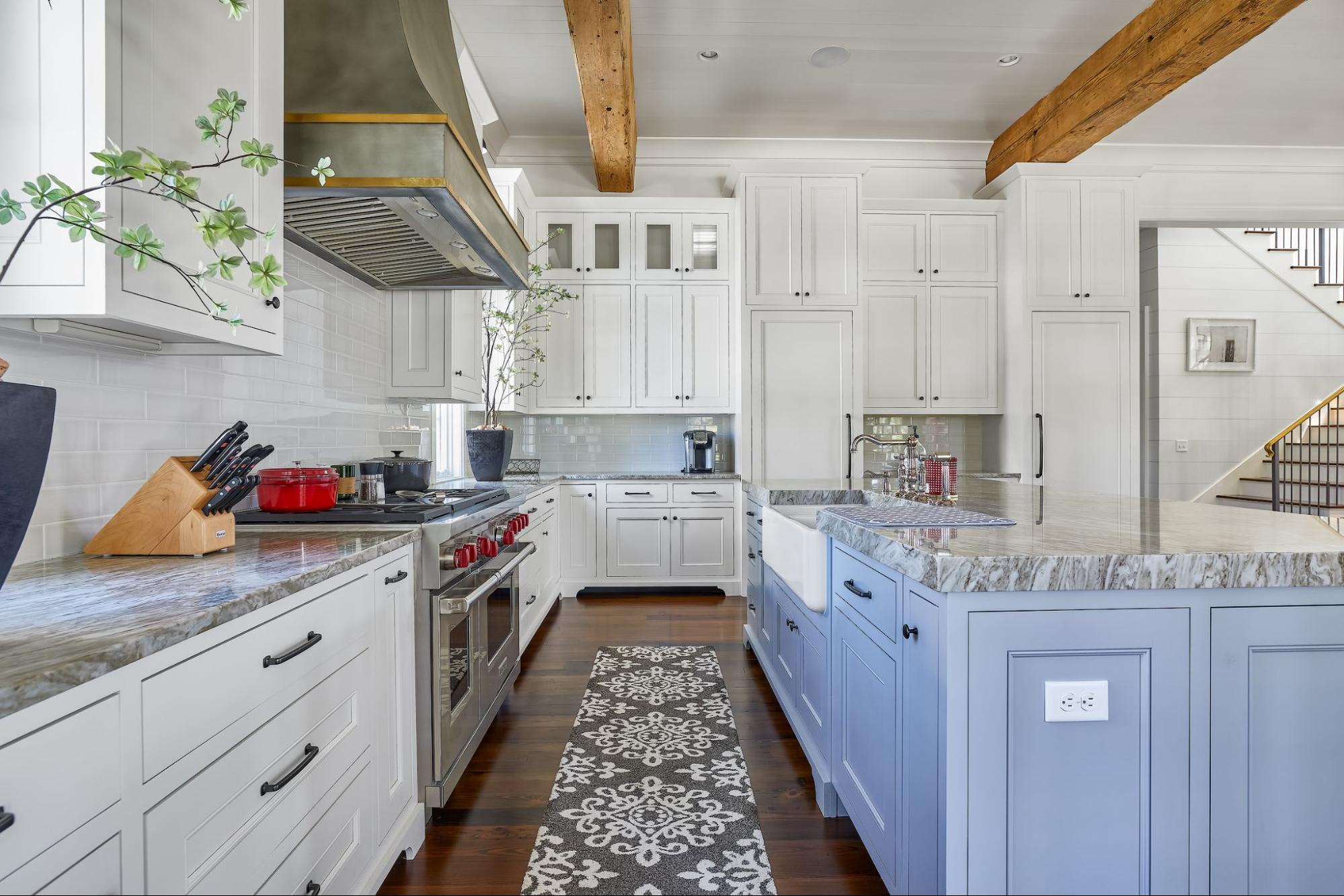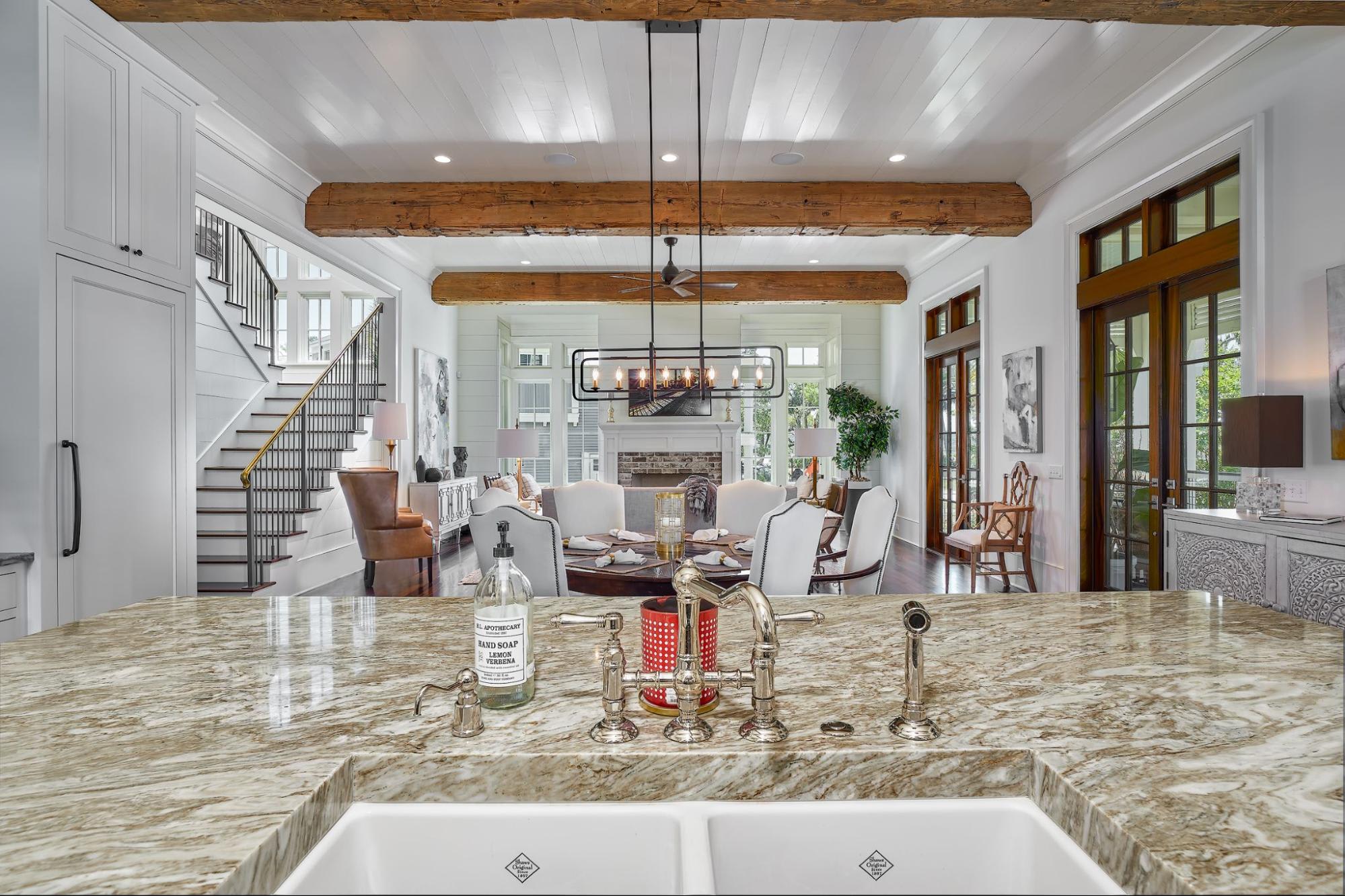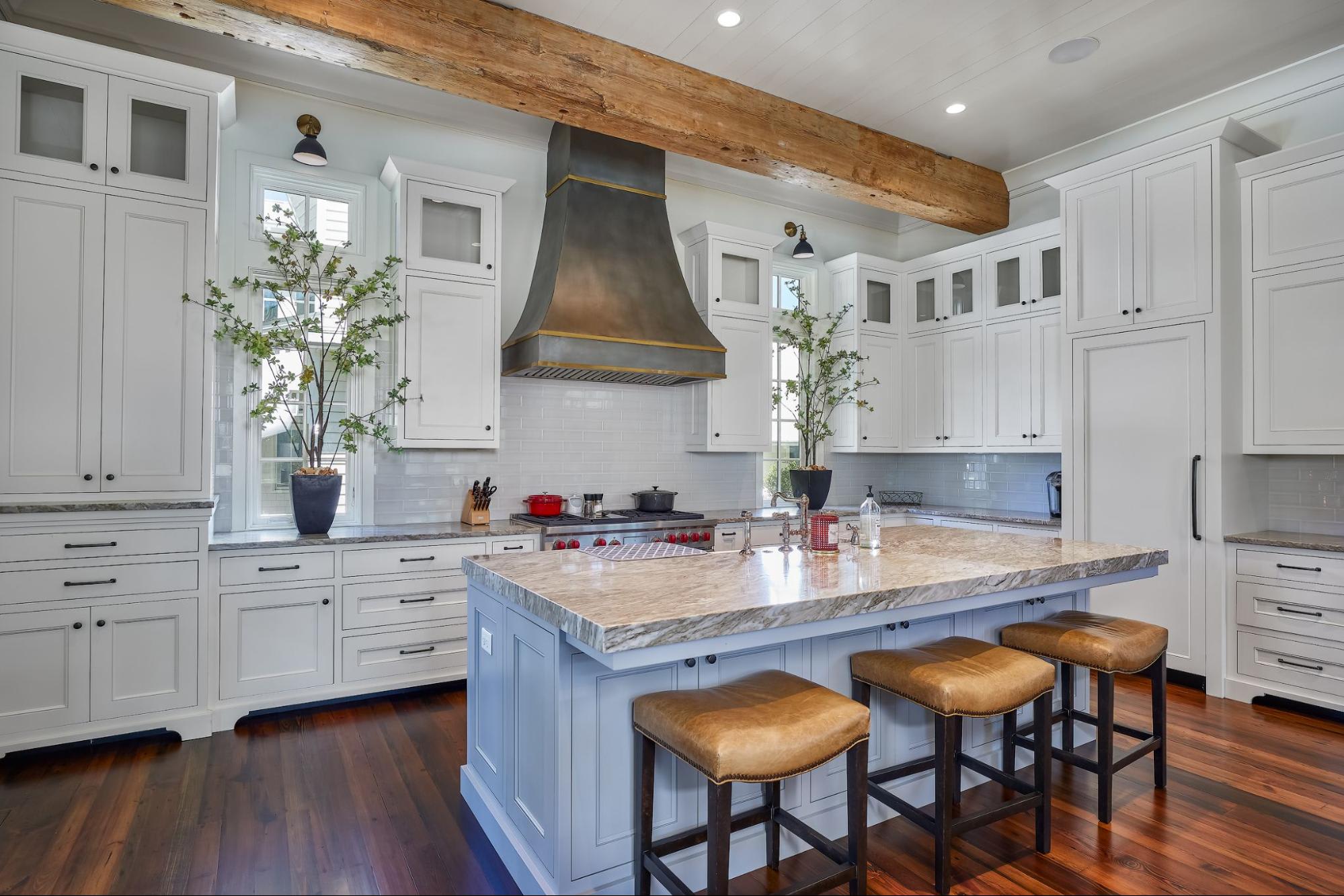 The expansive chef’s kitchen features wood beams and inset cabinets, as well as a spacious island, plenty of storage, and a Wolf gas range. Above the stove is a striking, custom-made zinc hood fabricated by Forsyth Metal Works in Savannah, Georgia. From the farmhouse-style sink to the elegant marble countertops, every detail was carefully considered to create an inviting space for cooking and entertaining guests.