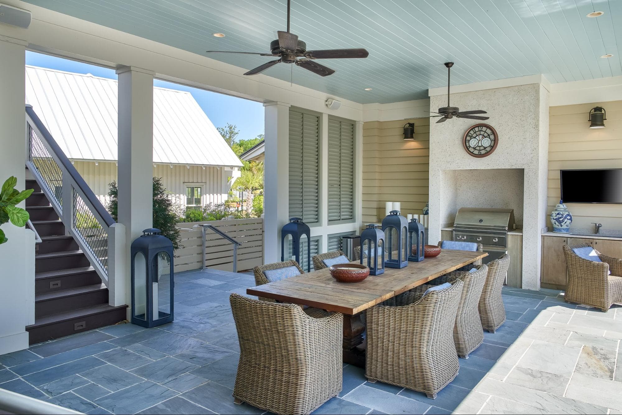 Dinner with a view! A large alfresco dining space with a built-in grill and entertainment center provides a comfortable yet stylish area for entertaining and is the perfect transitional space between the home’s interior and exterior living areas. Luxurious and functional features such as plantation shutters, ceiling fans, and natural stone floors make for the perfect setting for any dinner party or family gathering. The home’s equally spacious outdoor living areas offer plenty of room for entertaining or relaxing in the open air with family and friends.