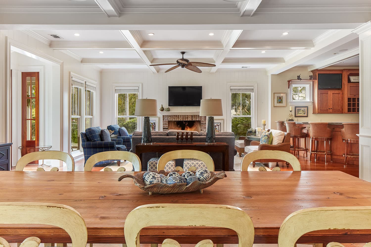 With its flexible first floor and endless entertaining options, the Palmetto Bluff property promises that when it comes to planning parties, you can say “the more, the merrier”– and actually mean it! The gorgeous wood cabinetry and sleek black countertops of the wet bar make it a great place to getaway and watch the game. Fold open the doors of the dining room to seamlessly unite the indoor spaces with the screened porch.
