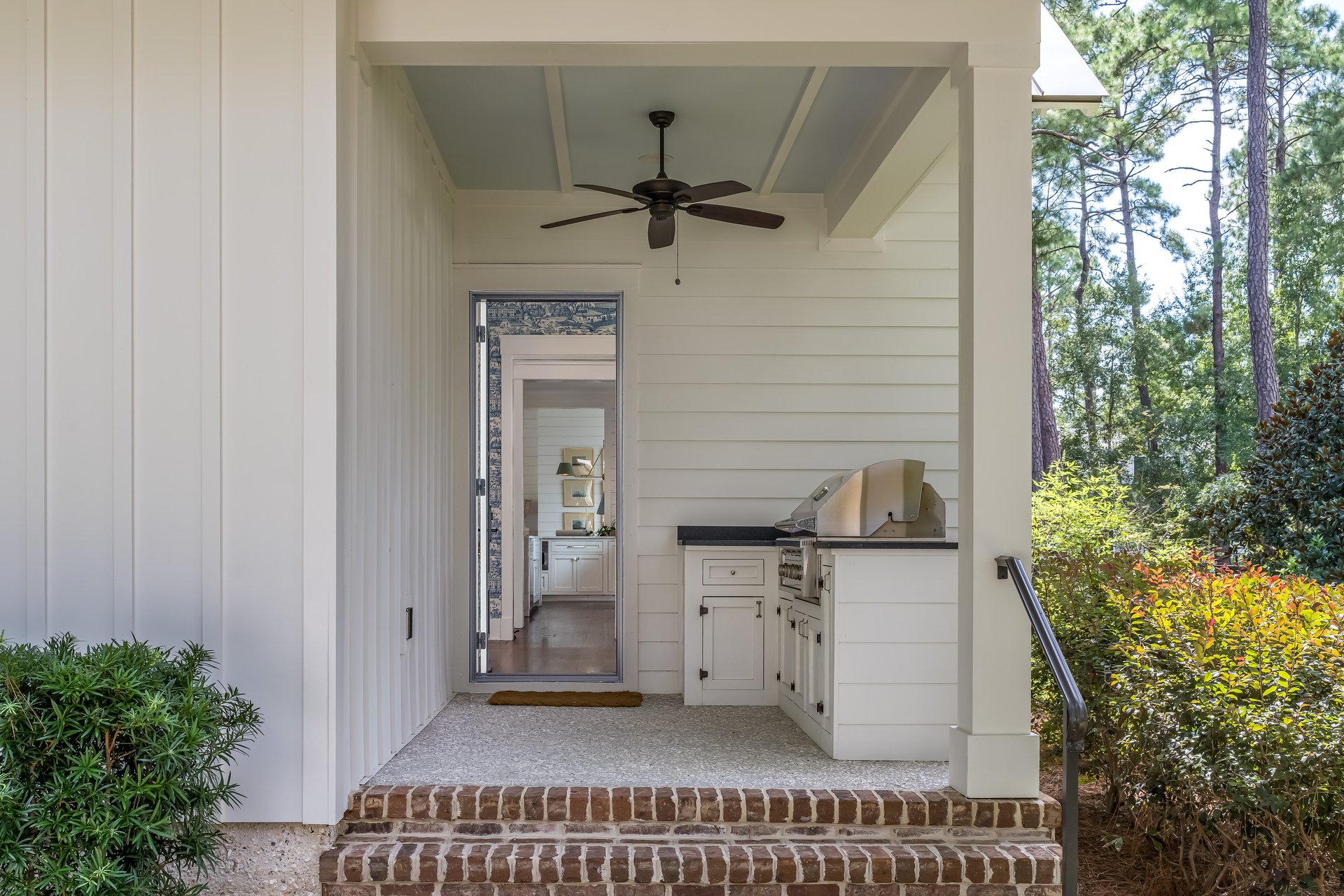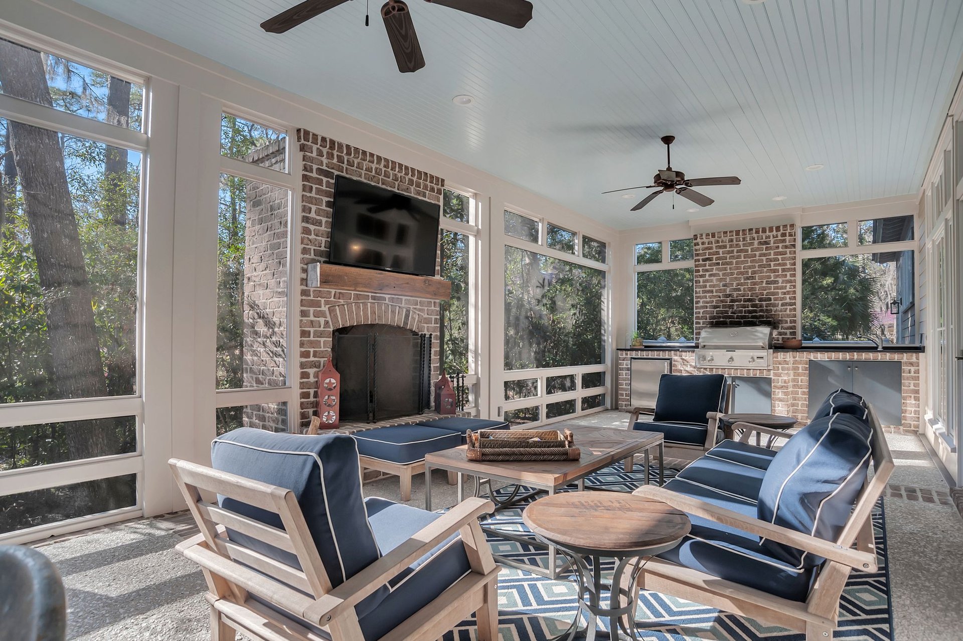 A hallmark of Lowcountry design is the use of natural, locally inspired materials. Incorporating these into your outdoor spaces adds character and timeless appeal. Think oyster shell accents, tabby concrete, reclaimed wood tables, brick pathways, and natural stone features. Fireplaces with oyster shell facades or aged brick detailing are especially popular in Palmetto Bluff homes, blending seamlessly with the surrounding landscape.